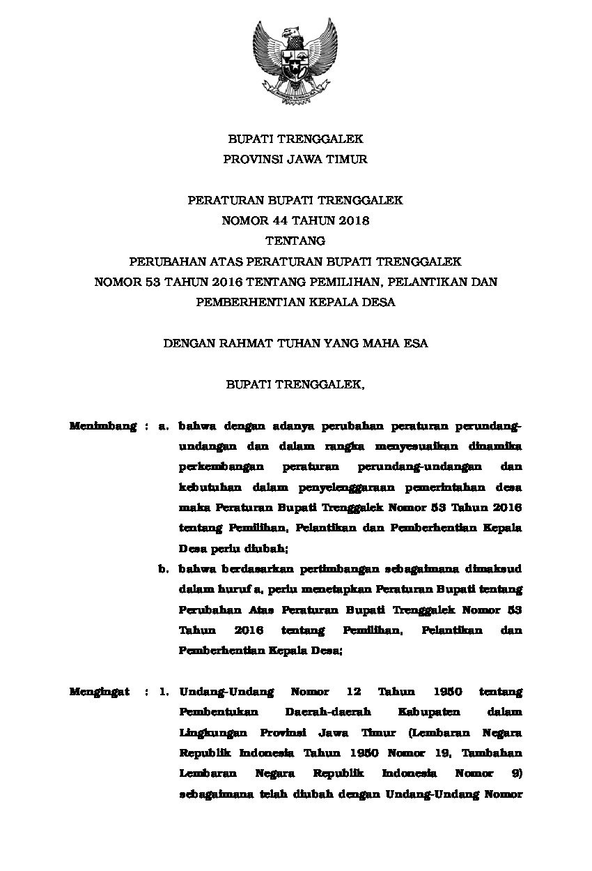 Peraturan Bupati Trenggalek No 44 Tahun 2018 Tentang Perubahan Atas Peraturan Bupati Trenggalek Nomor 53 Tahun 2016 Tentang Pemilihan Pelantikan Dan Pemberhentian Kepala Desa