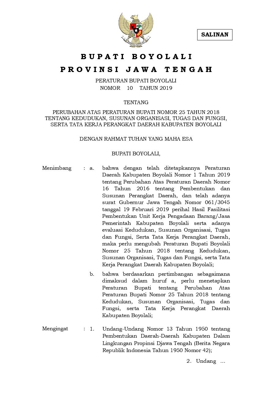 Peraturan Bupati Boyolali No 10 Tahun 2019 Tentang Perubahan Atas Peraturan Bupati Nomor 25 Tahun 2018 Tentang Kedudukan Susunan Organisasi Tugas Dan Fungsi Serta Tata Kerja Perangkat Daerah Kabupaten Boyolali