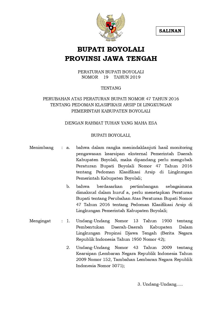 Peraturan Bupati Boyolali No 19 Tahun 2019 Tentang Perubahan Atas Peraturan Bupati Nomor 47 Tahun 2016 Tentang Pedoman Klasifikasi Arsip Di Lingkungan Pemerintah Kabupaten Boyolali