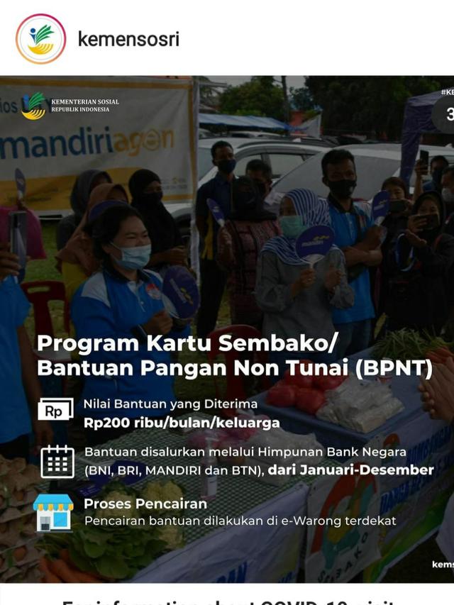 JAKARTA - Kementerian Sosial menetapkan penerima bantuan sosial untuk program keluarga harapan PKH diputuskan dengan mempertimbangkan tiga kriteria. Media menyampaikan coverage dari program perlindungan sosial di Indonesia pada saat Covid-19 juga masih di bawah rata-rata negara lain di dunia. Pada akhir 2019 program Bantuan Sosial Pangan di seluruh kabupatenkota dilaksanakan dengan skema nontunai atau BPNT.