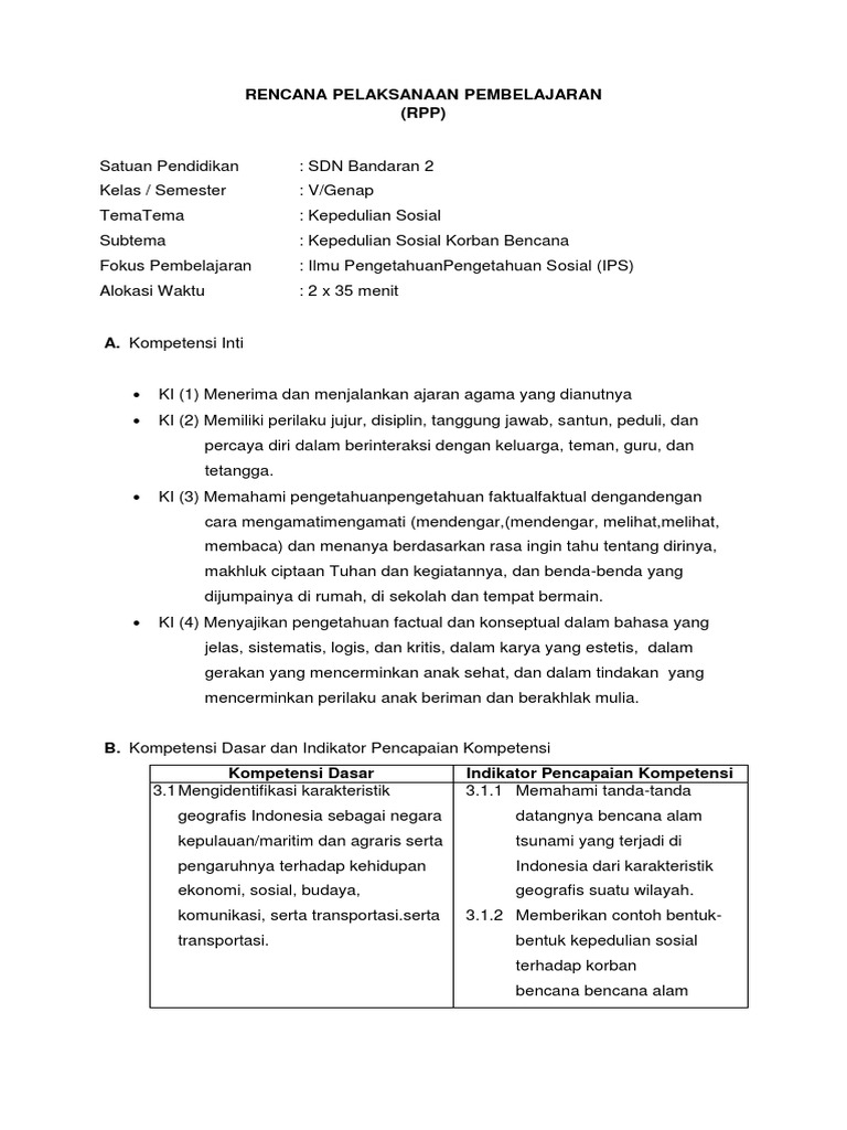 Rpp Tentang Kepedulian Sosial Membantu Korban Bencana Alam Ips Sd