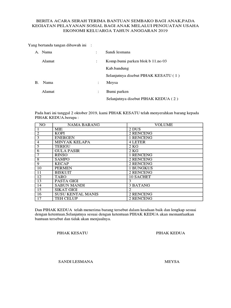 Berita Acara Serah Terima Bantuan Sembako Bagi Anak