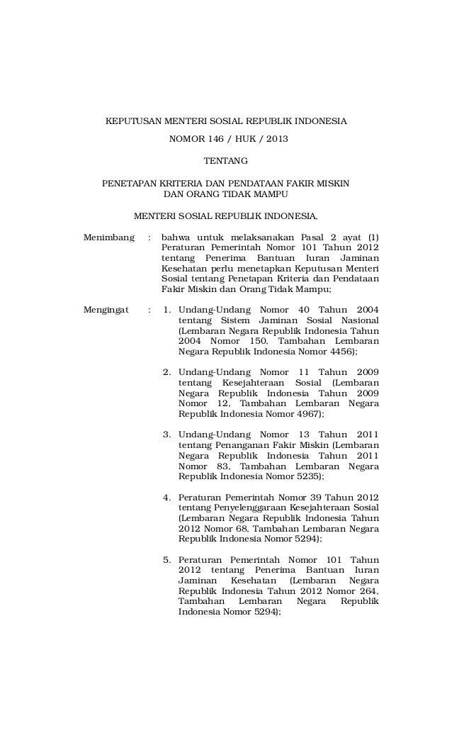 Hal ini sesuai dengan UU 13 Tahun 2011 tentang Penanganan Fakir Miskin Pasal 11 2 yang menyebutkan bahwa Data Terpadu yg telah ditetapkan menjadi dasar bagi Pemerintah dan Pemerintah Daerah untuk memberikan bantuan danatau pemberdayaan sosial. Perubahan atas Peraturan Menteri Sosial Nomor 25 Tahun 2013 tentang Kelas dan Nilai Jabatan Pegawai di Lingkungan Kementerian Sosial Berita Negara Republik Indonesia Tahun 2016 Nomor 1671. Peraturan Menteri Sosial NO.