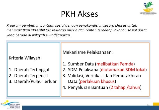 Program Keluarga Harapan yang selanjutnya disebut PKH adalah program pemberian ba n tuan sosial bersyarat kepada Keluarga Miskin KM yang ditetapkan sebagai keluarga penerima manfaat PKH. Sebagai upaya percepatan penanggulangan kemiskinan sejak tahun 2007 Pemerintah Indonesia telah melaksanakan PKH. PKH Akses adalah program pemberian bantuan sosial PKH di wilayah sulit dijangkau baik secara geografis ketersediaan infrastruktur maupun sumber daya manusia dengan pengkondisian secara khusus.